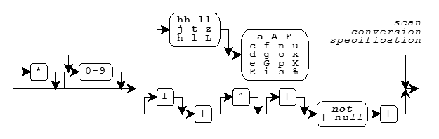 A scan conversion specification typically converts the matched input characters to a corresponding encoded value. The next argument value must be the address of an object. The conversion converts the encoded representation (as necessary) and stores its value in the object. A scan conversion specification has the format shown in the diagram.