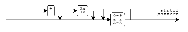 The initial characters of the string s must consist of zero or more characters for which isspace returns nonzero, followed by the longest sequence of one or more characters that match the pattern for strtol shown in the diagram.