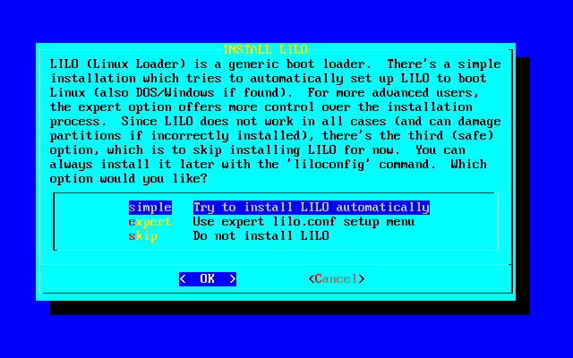 If this is your first time setting up LILO, you should pick simple. Otherwise, you might find expert to be faster if you are familiar with LILO and Linux. Selecting simple will begin the LILO configuration.