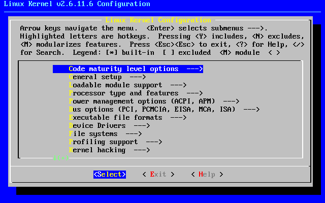 New users will probably find menuconfig to be the easiest to use. Help screens are provided that explain the various parts of the kernel. After configuring your kernel, exit the configuration program. It will write the necessary configuration files. Now we can prepare the source tree for a build:
